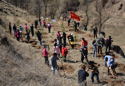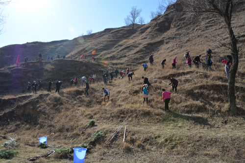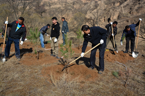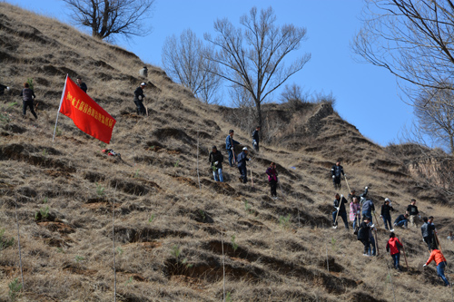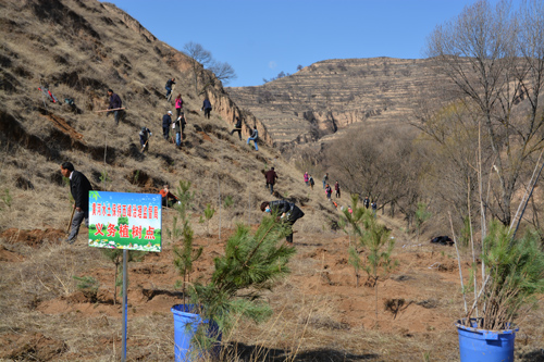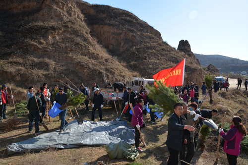 西峰局干部职工不畏坡陡沟深,手持铁锹、䦆头、水桶等工具相互配合、相互协作,挖坑、栽植、填土、培土、打边埂、浇水……每道工序都仔细认真,植树现场呈现出一派热火朝天的景像。经过5个多小时的辛勤奋战,共栽植油松、红叶杨等树苗800余株,为荒凉的山头添上了一片新绿。