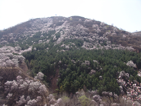 哎,还是借用唐代王涯一首《春游曲》“万树江边杏,新开一夜风。满园深浅色,照在绿波中。”来形容一下眼前的杏花。可爱好春色的朋友要知道,这南小河沟千万朵的杏花,不仅映照在沟底的池水中,还有中间大片的翠松陪衬着,红绿相映,美不胜收。故人王涯要是能看到南小河沟杏花还有四季常青松的点缀,诗句肯定比南宋叶绍翁的“一枝红杏出墙来”更广为人知了。