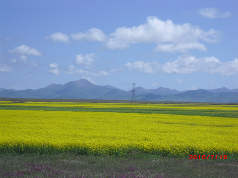 居住的地方是黄土高原,海拔1400m左右,油菜花一般是在春暖花开的时候开放。由于典型地形地貌的缘故,再加上包产到户,就是在油菜花开的最集中的时间里,也是很难看到成群连片的油菜花的。而青藏高原就不同了。一路西行,从第二阶梯爬上第三阶梯,在海拔2200m—3500m的地方,地形完整,连绵起伏,即使在盛夏时节气温也不过20℃左右,凉爽宜人。所以油菜花就选在这个季节,选在这片更加接近蓝天白云的青青草原上,肆无忌惮的绽放了,并且开的汹涌澎湃,开的一路豪歌。
