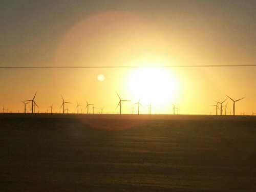 我们一路前行,一路工作,直到落日的余晖给戈壁涂上了一层红色,回程的路边一排排一行行转动的风力发电机发出耀眼的光芒,仿佛在向我们招手,欢迎我们下次再见。