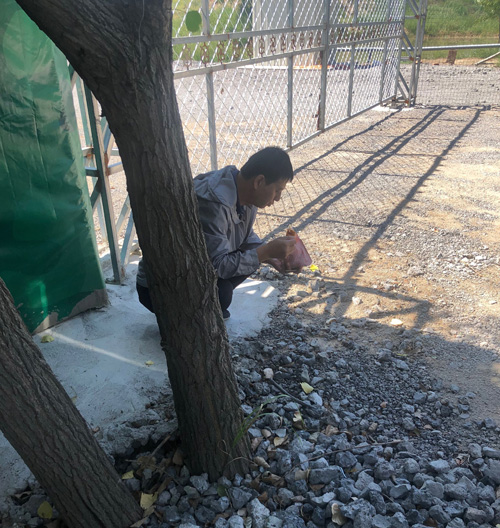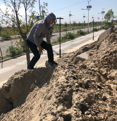 有的图斑由于废弃大门紧锁,在围墙外看不到里面的情况,就需要找破洞,爬土堆,翻围墙。而我有次就在一个料场堆上面,由于料场顶有苫盖,下面是空的,一脚踩下去就从上面摔到了地下。李维斌同志也在爬土堆时,脚下一滑,摔破了膝盖。