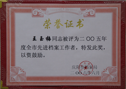 又讯:在此次会议上,我局档案室管理员王玉梅同志获“2005年度全市档案工作先进个人”。