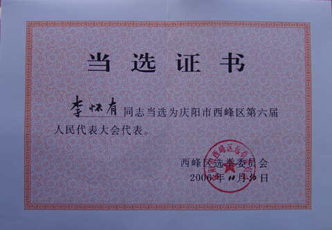 我局根据有关会议精神和文件要求,通过民主推荐、综合考察,向西峰区人大推荐了李怀有同志为人大代表候选人,经过分区差额选举,被正式选为西峰区人大代表。12月3日西峰区五届人大常委会第二十六次会议通过,李怀有同志当选为庆阳市西峰区第六届人民代表大会第一次会议主席团成员并担任第二次大会执行主席和计划预算审查委员会委员;12月10日西峰区第六届人民代表大会第一次会议选举李怀有同志为庆阳市西峰区第六届人大常委会委员。