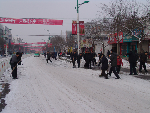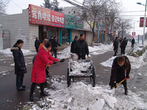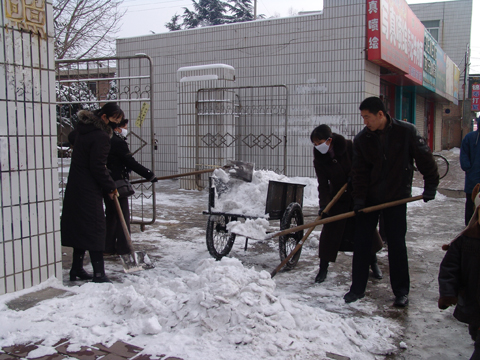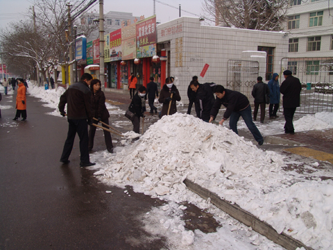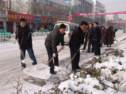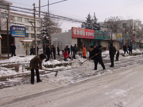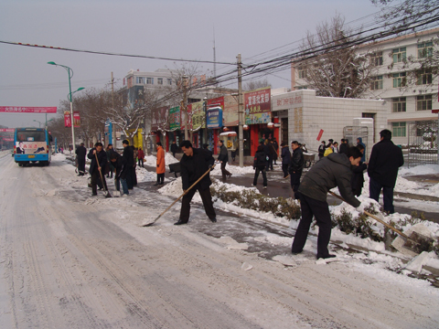 1月14日,今年的第一场大雪之后,西峰治理监督局即组织全体职工清扫大门前道路的积雪。这是该局2008年第一次组织的集体公益活动,各科室部门负责人积极号召本部门人员参加,据统计参加人数占应参加的95%以上。在清扫积雪中,广大职工铲、推、拉、抱并举,对结冰难铲的路段撒上工业盐,使路面积雪得到彻底清除,得到了路人的好评。