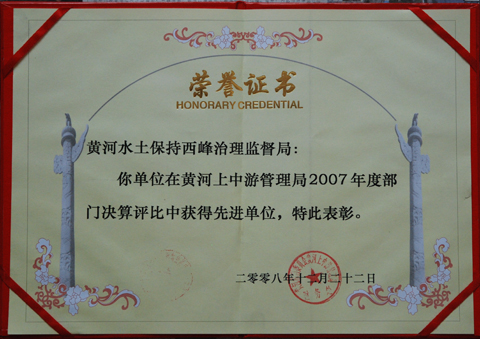 2008年12月23日,在黄河上中游局组织召开的年终决算会上,我局财务科获得黄河上中游管理局2007年度部门决算及基建财务决算先进单位。同时左荣、牛巧玲同志获得先进个人称号。
