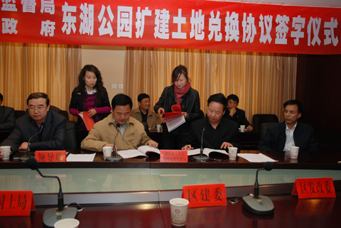 签字仪式上,首先由西峰区建委主任麻新民同志介绍了东湖公园扩建工作进展情况;西峰治理监督局局长毛效嗣同志宣读了黄河上中游管理局关于土地兑换的批复文件。随后西峰区人民政府区长冯光敏与西峰治理监督局局长毛效嗣签定了《土地置换协议书》、《土地地上附属物补偿协议》书。