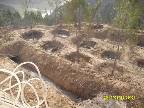 工程施工人员按照施工方案进行施工,分别对挖方边坡区、平台区、填方边坡区、水库左岸取土场及疏林地(水库溢洪道上部)区等部位进行绿化,绿化苗木有侧柏、火炬树、美国红枫、爬山虎、水蜡等6种共计约2300株。