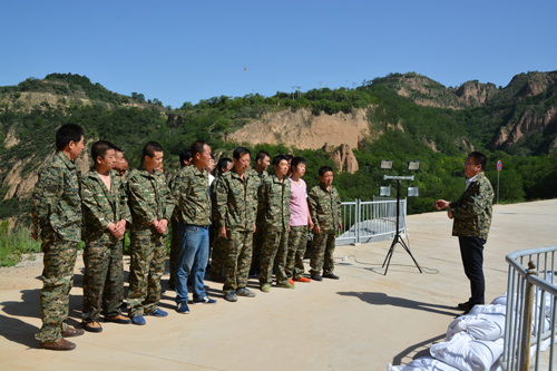 演练设定为夜间,暴雨情景模拟花果山水库遭受连续强降雨,导致水位急速上涨,超过汛限水位,且当地抗旱防汛部门继续发布暴雨橙色预警,花果山水库大坝防汛巡查人员发现险情并上报。接到险情后,西峰局紧急部署,立即启动应急预案,应急抢险人员很快在花果山水库管理所前集结。按照预案,物资装运组迅速装运防汛设备物料运往现场,抢险队成员也按照所划分责任区,迅速到位。下流径流泥沙测站人员紧急转移。