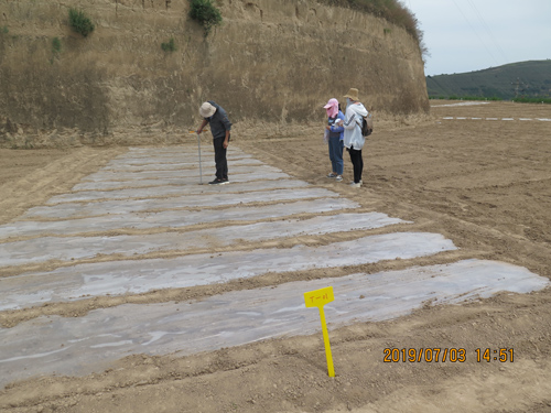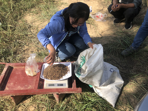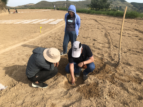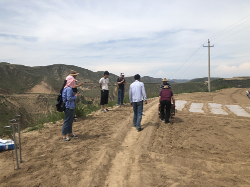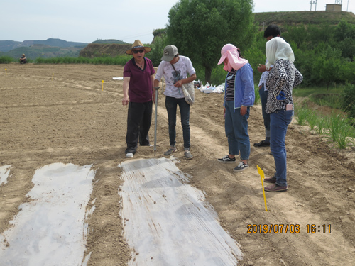 7月3日,项目组邀请技术专家作为指导,一同前往试验田进行牧草播种。采取3种牧草,使用覆膜、裸地,以及化肥的3种不同剂量、共计18个试验组合,覆膜采用点播和裸地采用条播的方法进行播种。种植过程中,技术人员根据有关资料和经验确定种植密度和深度,并对试验小区的土壤含水率和容重进行了测定。通过项目组的精心种植,完成了试验牧草的种植任务。