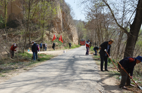 确定分组分工后,接受任务的党员及青年职工分头展开。一边,参加“党员林”造林活动的党员干部们纷纷从车上拿起铁锹、䦆头、水桶等工具往前马山党员林造林点开展造林。另一边,参加健步行的青联成员及干部职工由马山出发,徒步前往十八亩台“青年林”造林点进行健步行活动。马山造林点上,党员们一起动手,两三人一组,个个热情洋溢,干劲十足,有的扛树苗、有的回填泥土、有的扶正树苗、有的提桶浇水、有的覆土踩实、有的制作边梗等,大家配合默契,一丝不苟,享受着劳动的快乐。健步行路上,大家手提编织袋,沿着道路时而低头捡拾路旁垃圾,时而抬头欣赏沿途美景,年轻职工们听着老同志们谈论着过去工作中精彩故事和工作点滴,感受几代水保人栉风沐雨创造南小河沟高原翡翠的不易和艰辛,一路上欢声笑语、健步前行。