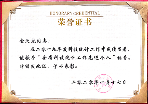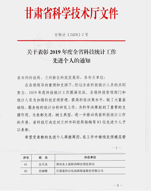 近日,从甘肃省科技厅传来喜讯,西峰局金天龙被授予“2019年度全省科技统计工作先进个人”称号。