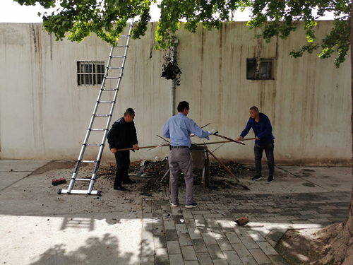 5月9日,局后勤服务中心自发组织科室职工拿起铁锹、扫帚,端起簸箕,登上扶梯,对临街房屋房顶的枯枝树叶、建筑垃圾等进行了清理拉运,对自行车棚内的积水和花园周围的死角垃圾进行了清扫,对办公楼一层雨棚的积水进行了疏通,他们以实际行动为机关环境美化贡献着力量。