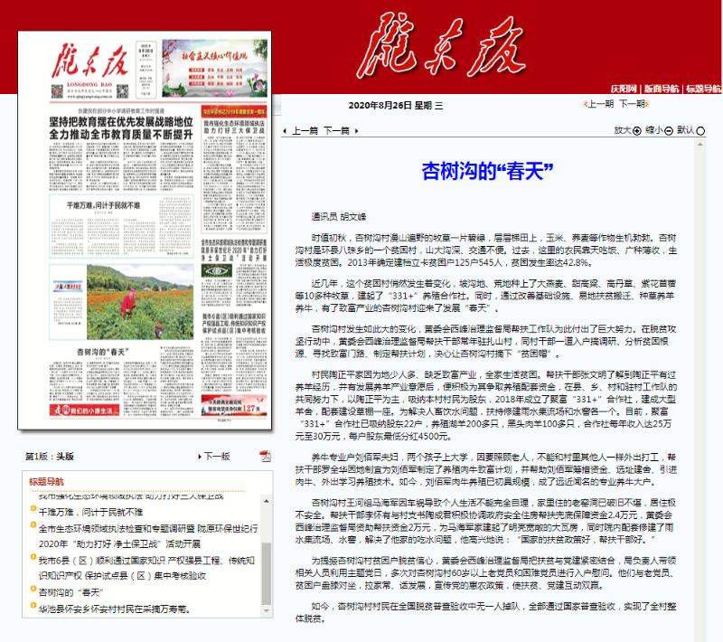 2020年8月26日,由西峰局派驻杏树沟村扶贫工作人员胡文峰同志撰写的脱贫攻坚帮扶工作报道“杏树沟的春天”一文刊登《陇东报》头版。