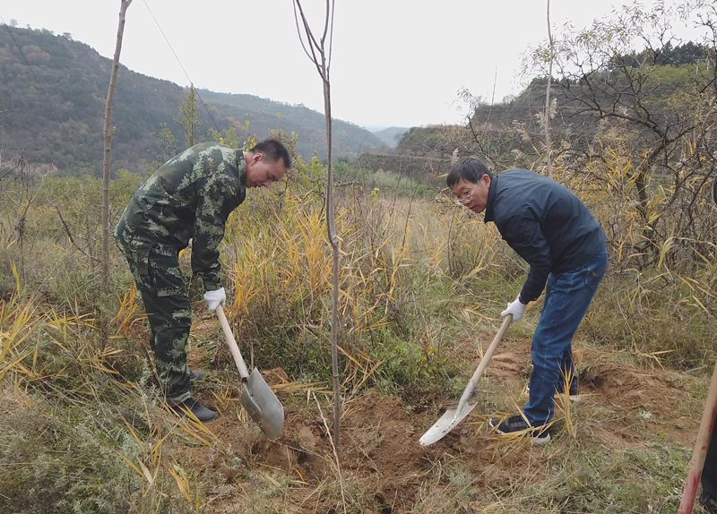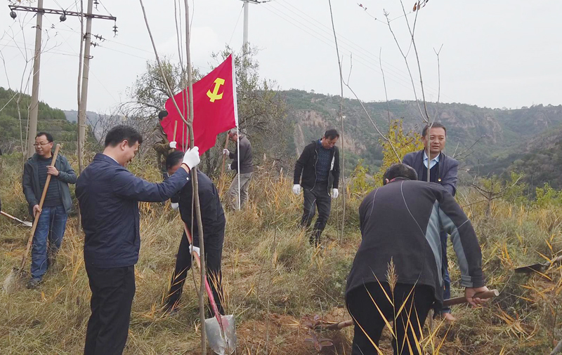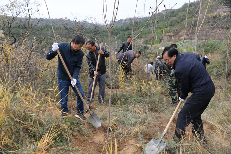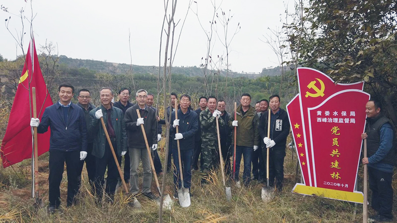 刘正杰一行参观了黄河先锋党支部——南小河沟试验场党支部党员活动室,交流了“三会一课”等党内组织生活的作法与经验。随后,黄委水保局与西峰局30余名党员来到南小河沟试验场马山植树点,共同栽植“党员共建林”。全体党员们挥锹铲土、挖鱼鳞坑、扶直树苗、培实新土,大家干劲十足,动作熟练,配合默契,圆满完成了植树任务。一棵棵新栽植的火炬树错落有致地顶风挺立,呈现出勃勃的生机,为南小河沟增添了一道亮丽的景致。