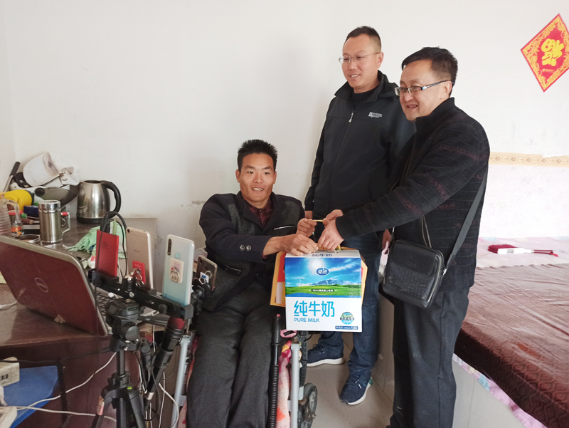 曹寺台组兰付堂家孩子兰正升在十年前上学读书时不慎掉下沟底摔断双腿,历经大小手术数十多次最终没能治愈,落下终身残疾,行动不能自理,同时家里也因给孩子看病背负巨额债务,属于典型的因病致贫。驻村工作队王建民了解情况后,多次到兰付堂家了解情况。鼓励他要身残志不残,给他讲保尔柯察金和张海迪的故事,帮助他树立正确的人生观价值观,一技在手足可养家,就这样兰正升开始学习手机网络直播,他把身边发生的事情和党的扶贫政策以及杏树沟这几年的巨大变化通过手机网络直播让更多的人知道了解八珠乡村这几年翻天覆地的巨大变化,昔日的贫困户如今不但有饭吃有衣穿,而且是吃得好穿的暖,过去破旧不堪濒临坍塌的老危窑洞如今也变成了明亮宽敞的大瓦房,看病国家有医疗报销,孩子上学有保障,家里也通上了自来水。同时村上也根据具体情况为兰付堂安排了护林员工作岗位。如今兰付堂一家住在八珠新农村,生活幸福,逢人就说:“要不是党的扶贫政策好,黄委会的扶贫入户做得好,我现在还不知道是个啥样子呢,真是想都不敢想呀!”