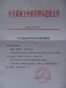 经中共黄河上中游管理局党组(黄党发[2004]2号)研究决定:张虎林同志任黄河水土保持西峰治理监督局(西峰水土保持科学试验站)副局长(副站长)、党组成员。