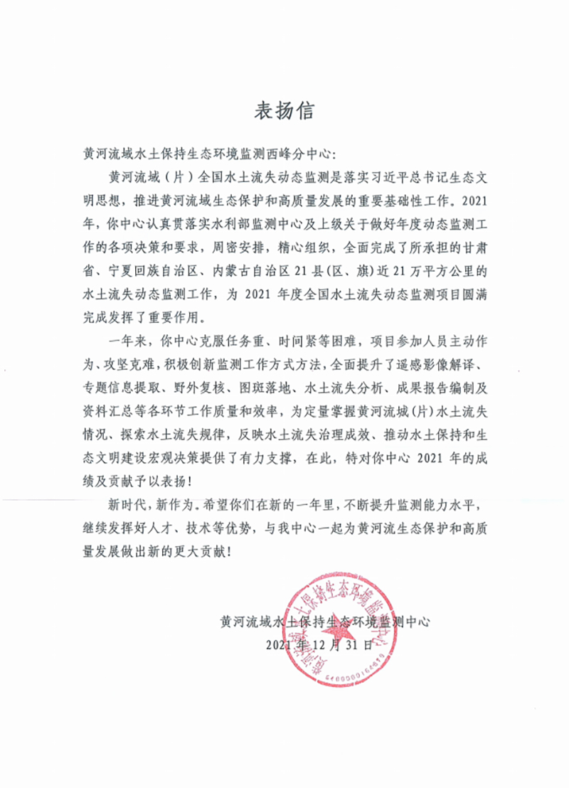 近日,黄河流域水土保持生态环境监测中心向西峰监测分中心发来表扬信,这印证着在西峰局所承担的2021年度黄河流域(片)全国水土流失动态监测项目中交出了一份合格答卷。