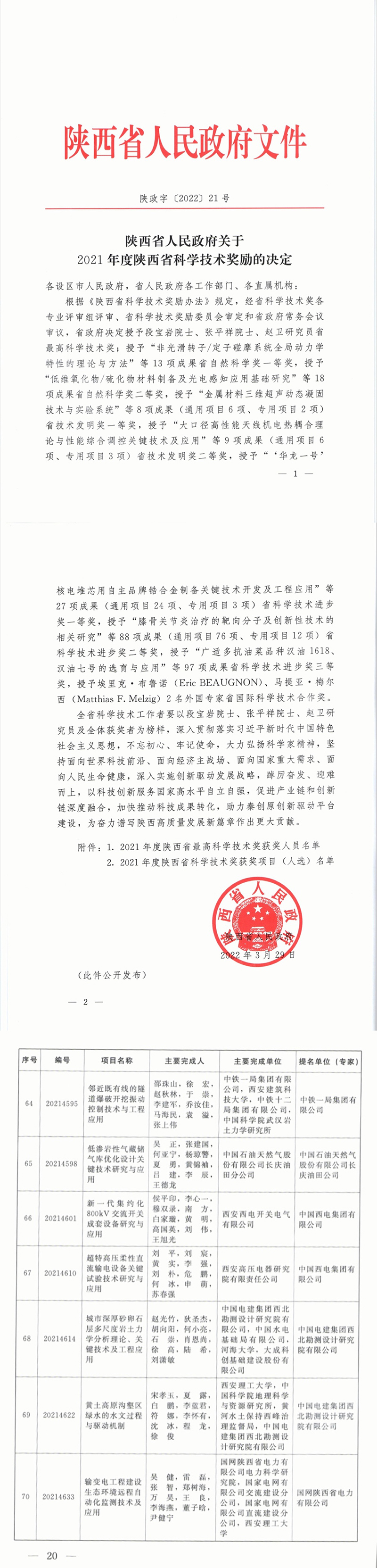近日,陕西省人民政府发布《关于2021年度陕西省科学技术奖励的决定》(陕政字[2022]21号),西峰局榜上有名。由西安理工大学主持、西峰局作为主要完成单位(排名第三)完成的科研成果《黄土高原沟壑区绿水的水文过程与驱动机制》荣获2021年度陕西省科技进步二等奖。西峰局副总工、科研中心主任李怀有(排名第六)参与了项目研究全过程,这是西峰局与西安理工大学合作承担的国家自然科学基金项目取得的硕果。