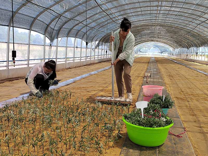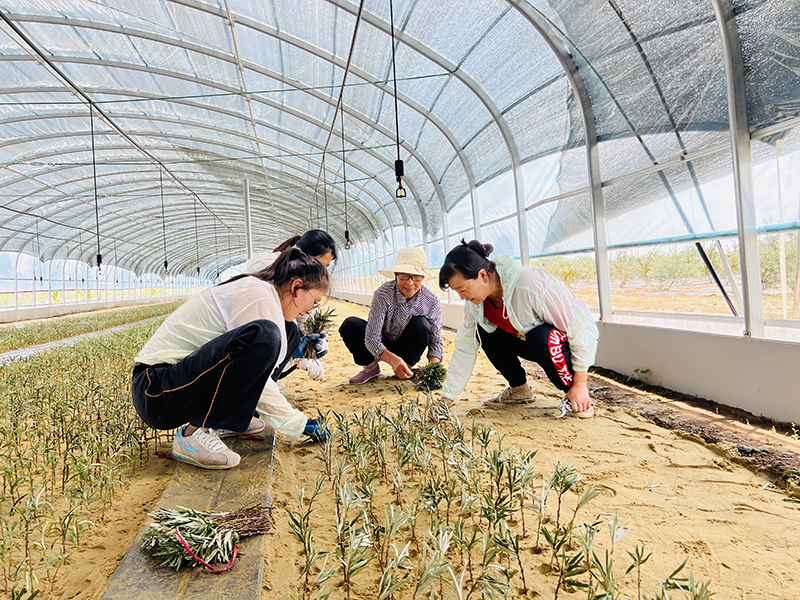 骄阳盛夏,陇原热土;水汽蒸腾,万物勃发。走进董志试验场,入眼就是闫晓玲教授带领植物试验组的各位技术人员在良种沙棘示范园里辛勤劳作的场景。站在这片充满生机的土地凝眸回望,从4月份开始筹建沙棘育苗温室大棚、铺设防草地膜、除草施肥、整地灌溉、铺垫渗水层到7月初完成扦插前的所有准备工作,他们都热情澎湃、亲力亲为、事无巨细,近日终于迎来了扦插育苗的好时机。头雁领飞,群雁紧随。闫教授带领大家顶着烈日穿梭在田间地头,先采集沙棘优株嫩枝,再将采集到的嫩枝按不同品种分类编号,剪去多余枝叶,留10-15cm的根,浸泡在水中。随后进入大棚中扦插,入土深度为插穗的2/3-3/4,以插穗顶端的芽露出地面1-2厘米为宜,过程中不能损伤皮层,以免影响成活率。温室大棚里闷热潮湿,每个人都蹲在地里弯腰插苗,汗流浃背,腰酸腿疼,但谁也不肯停工休息,生怕影响扦插进度,他们全力以赴,快马加鞭,连着几日挑灯夜战也毫无怨言。510平方米的试验田,全部扦插完成需要七八天,每天进棚时还顶着炎炎烈日,出棚时已伴着点点星光。