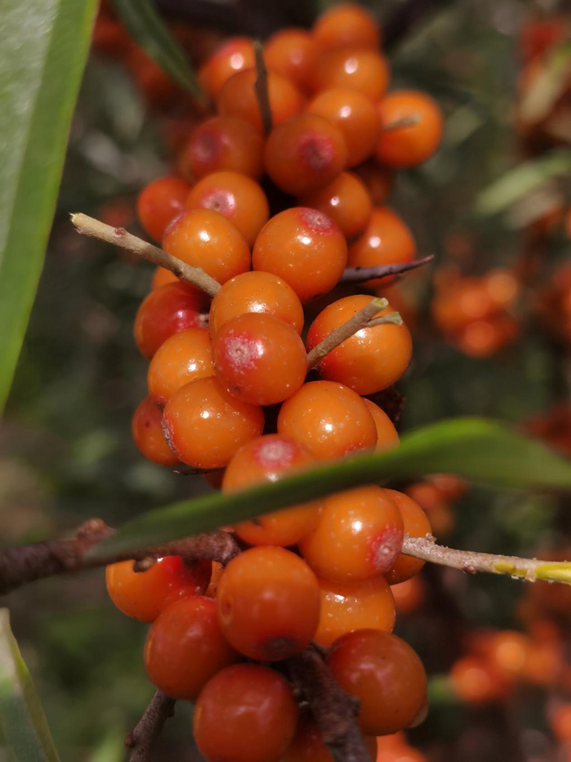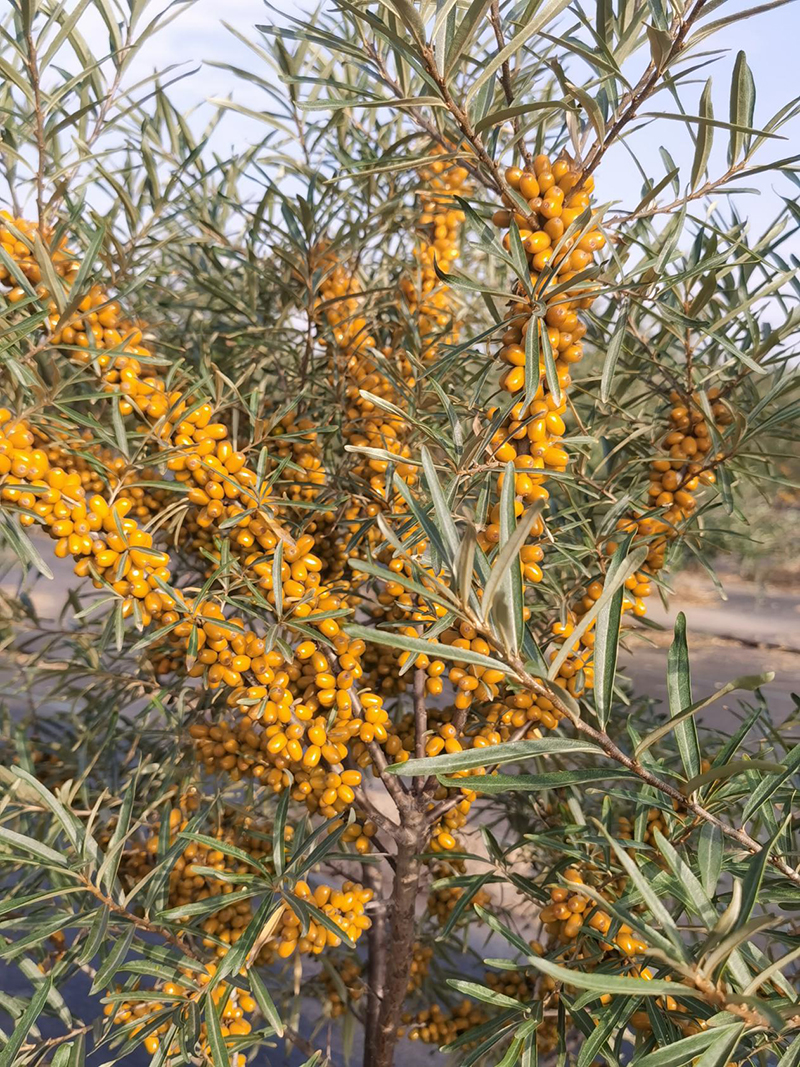 每到春暖花开时,园区多种植物竞相绽放、芳香扑鼻;盛夏时节,良种沙棘、长柄扁桃、文冠果等果实相继进入成熟期。特别是从俄罗斯引的20多种大果沙棘,黄澄澄、红彤彤的沙棘果实,密密麻麻压弯了枝头。秋季时分,示范园区内苦水玫瑰、忍冬(金银花)等植物依然花满枝头。温室大棚内新育苗枝繁叶茂,生长旺盛,到处一片生机勃勃的景象。