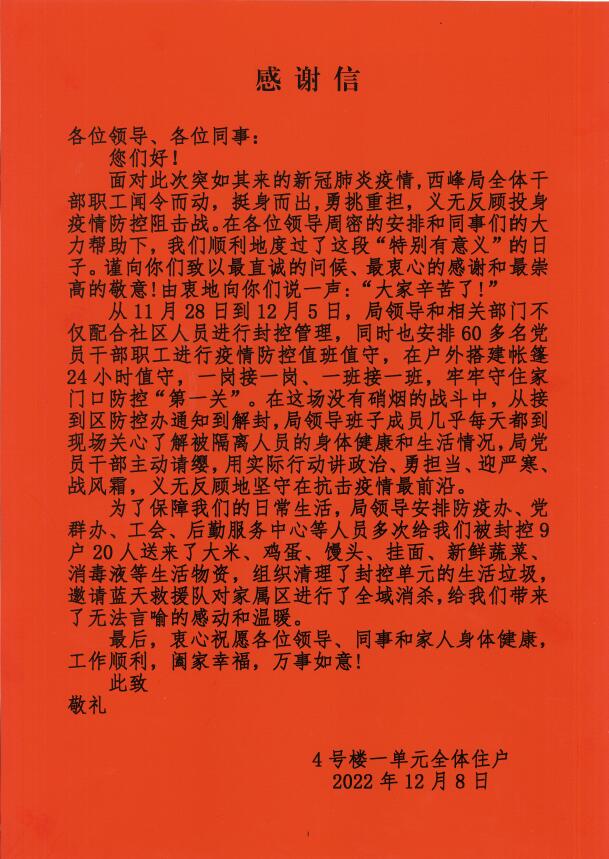 12月8日,西峰局接到了家属区住户代表赠送的一面写着“守望相助情系职工众志成城共抗疫情”的锦旗和一封感谢信,代表家属区住户衷心感谢西峰局在抗击疫情第一线严防严控,守护居民的安全和健康。
