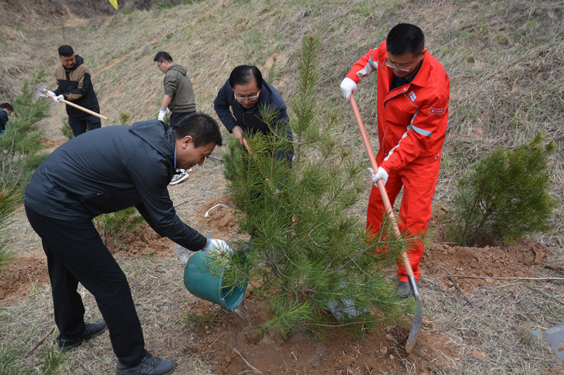 上午8时许,双方全体干部职工来到南小河沟植树现场,西峰局对长庆油田物探公司286队一行的到来表示了热烈的欢迎,再进行了简单的介绍交流后,大家便紧锣密鼓的投入到了植树活动中。活动现场,每个人都干劲十足、热情高涨,在春日的暖阳下,大家或两人一组,或三五搭档,配合十分默契,一起挥锹铲土、搬运树苗、扶苗填坑、培土踩实、围堰浇灌,一丝不苟地做好每道工序。经过大家近三个小时的共同努力,300余棵崭新树苗排列整齐、迎风而立,为南小河沟增添了新绿。
