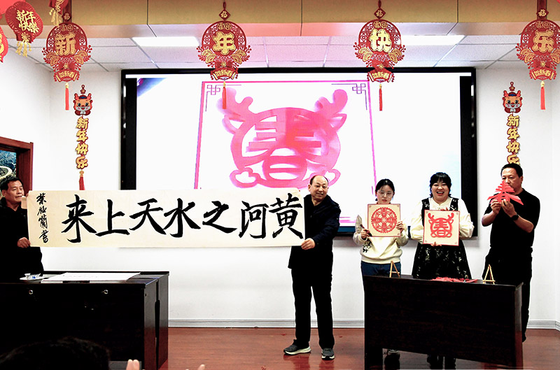 联欢会上,西峰局全体干部职工欢聚一堂,自编自导自演了精彩纷呈的文艺节目,共同迎接甲辰龙年的到来。喜庆欢乐的歌舞串烧《潮流拜年》拉开了联欢会的帷幕;歌曲联唱《早安黄河》、合唱《保卫黄河》、诗朗诵《黄河的诉说》,表达了基层治黄工作者对黄河的深厚感情和对黄河保护治理事业的无限热爱;歌曲《蓝色的蒙古高原》《如愿》《歌唱祖国》《团结就是力量》用深情与力量祝福伟大祖国、礼赞伟大新时代;朗诵《我爱上班》、舞蹈《敬业阵线联盟》充分展现了西峰局干部职工履职尽责、勤勉奉献的饱满干劲,弘扬了担当作为、干事创业的正能量;吉他独奏《天空之城》、歌曲《大城小爱》《大鱼》《丝绸之路》、诙谐舞蹈《小人舞》等节目充满青春与时尚气息,充分展现了西峰局青年职工的多才多艺和激情活力;《剪纸与书法现场表演》呈现了中华传统文化的独特魅力,让我们更加充满文化自信;三句半《恭贺新禧》、诗朗诵《新年的愿望》表达了大家对新年的美好期待和无限憧憬。