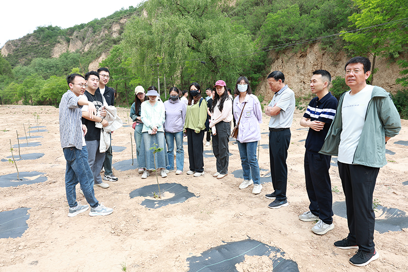 在“高塬沟壑区木本粮油树种引种试验示范研究”课题试验布设地,课题主持人李超向大家介绍了课题立项背景、技术路线及研究进展情况。
