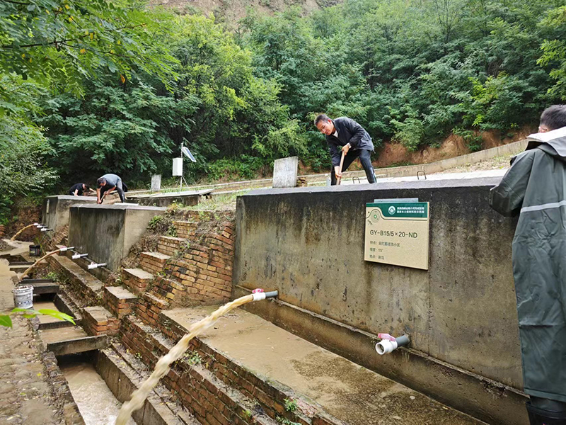 在连续两日的暴雨侵袭后,7月24日下午,雨势终于渐渐停止。为了准确取样和收集雨后的相关数据,科研中心的五名科研人员以及来自测站的员工,一同前往湫沟和马山径流小区,分工合作,取样并细致记录各个小区的径流量、土壤含水率等关键数据,并清理集水池中的淤泥和径流。