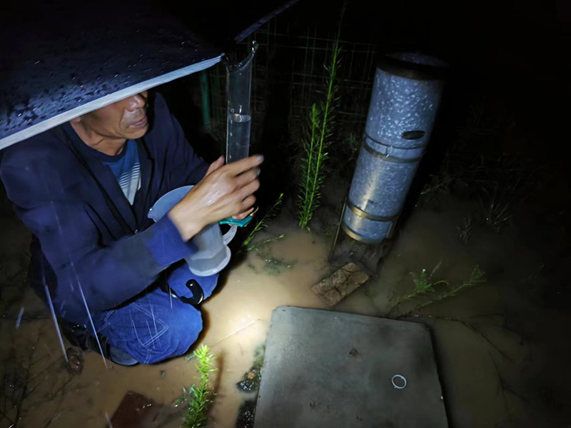 22日晚间9:30点暴雨如注,科研中心相关技术人员及时出动赶赴十八亩台、董庄沟、杨家沟、湫沟等径流站和径流小区冒雨开展观测。面对恶劣的天气条件,工作人员手持手电筒,身着雨鞋,两人一组,在昏暗的光线下,踏上了崎岖泥泞的山路。尽管积水已盖过雨鞋,他们仍相互搀扶,稳步前行,以确保能够准时到达观测点进行观测工作。
