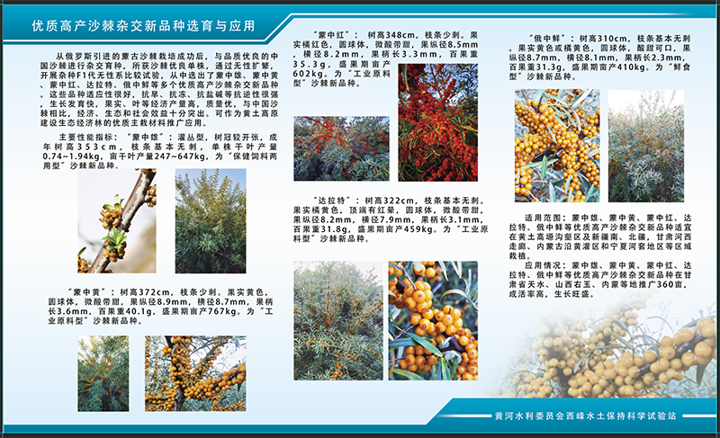 沙棘为胡颓子科植物沙棘属,因其喜光、耐旱、耐寒、耐盐碱的特性,而被广泛应用于水土保持和沙漠绿化。西峰局自上世纪90年代,就开始了优质高产沙棘的引种试验工作,将果实硕大的蒙古沙棘与适应性强的中国沙棘进行杂交,所获沙棘优良单株,通过无性扩繁,开展杂种F1代无性系比较试验,从中选出了蒙中雄、蒙中黄、俄中鲜等多个优质高产沙棘杂交新品种。这些沙棘抗逆性强,生长发育快,果实、叶等经济产量高,生态、经济和社会效益十分突出,可作为黄土高原地区建设生态经济林的优质主栽材料推广应用,在黄土高塬沟壑区水土流失治理、黄河生态保护上发挥出更显著的成效。