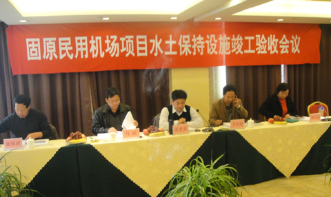 在会上验收组成员认真听取了技术服务单位关于水土保持措施实施情况汇报。固原民用机场于2008年4月动工,2010年9月底完成了水保方案设计的各项工程、绿化、临时措施,项目共完成工程措施浆砌石截排水沟108062m,干砌石护坡面积108523m2, 排水涵洞484m, 沟道防护工程消能池2座。机械整地4.6hm2, 土地复耕41.6hm2, 地表土剥离56300m3, 二次搬运土方23320m3。植物措施131.49hm2,其中乔、灌木17165株,草本植物2568m2,花卉及小灌木21460m2。临时措施彩钢板拦挡50516m2, 防尘网覆盖30603m2。