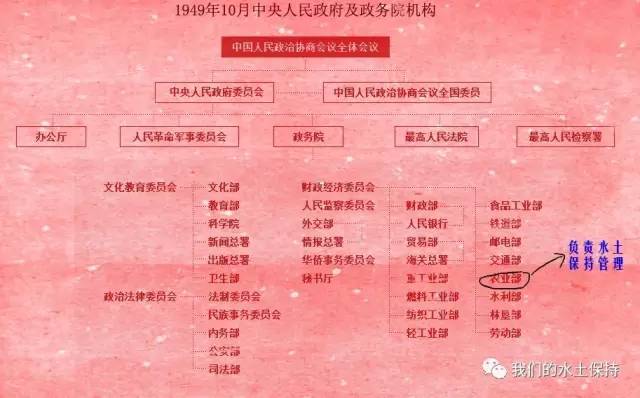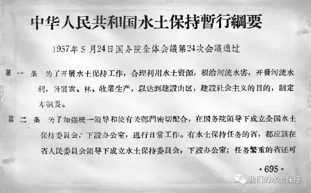 1957年,为了加强水土保持工作的统一领导和部门之间的密切配合,国务院发布《中华人民共和国水土保持暂行纲要》,决定在国务院领导下成立全国水土保持委员会,统一管理全国的水土保持工作,办公室设在水利部;同时要求凡有水土保持任务的省,都应该在省人民委员会领导下成立水土保持委员会。