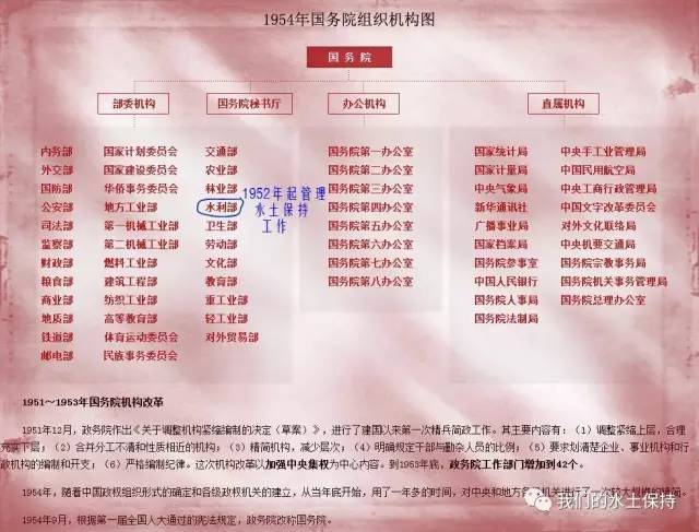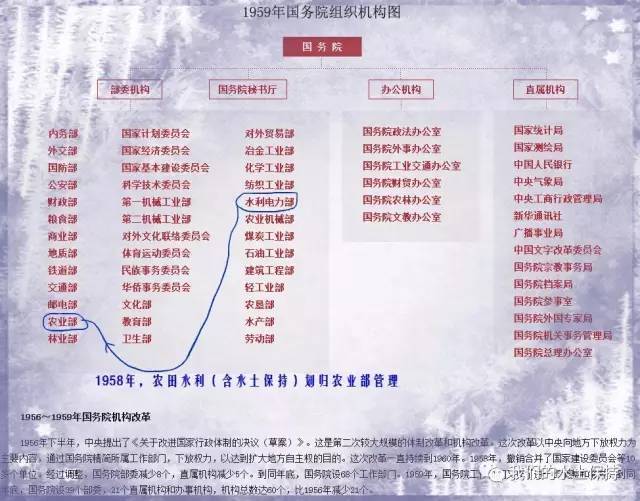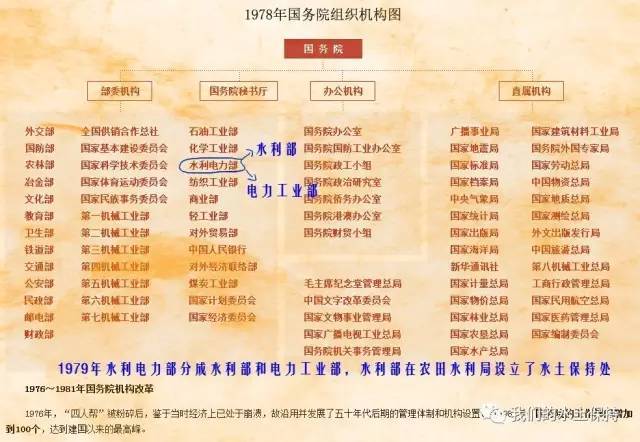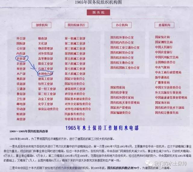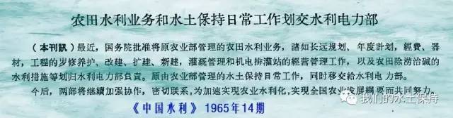 1958年,水利部与电力工业部合并成立水利电力部,国务院决定除黄河流域水土保持日常工作仍由黄委会负责外,将原由水利部主管的农田水利(含水土保持)工作划归农业部统一管理。