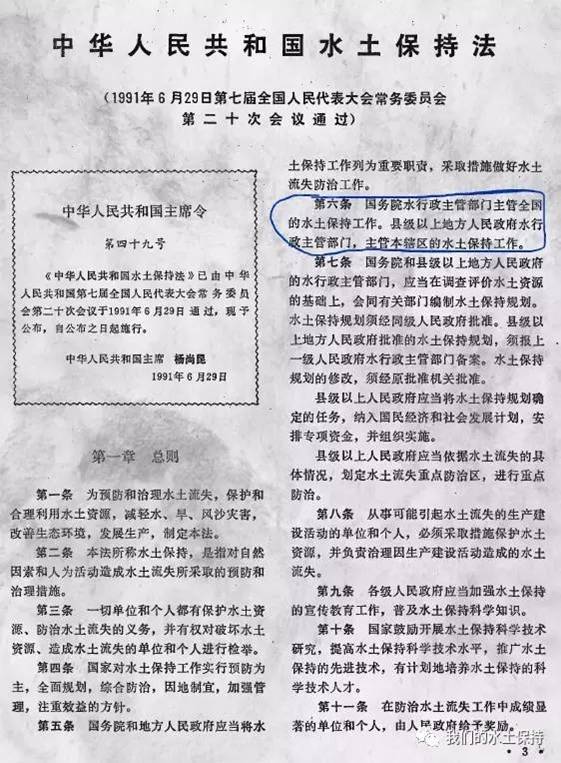 1991年水土保持法出台,规定“国务院水行政部门主管全国的水土保持工作。县级以上地方人民政府水行政主管部门,主管辖区内的水土保持工作”(第六条),明确水行政主管部门主管水土保持工作。