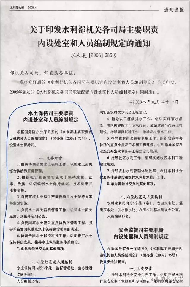2008年,国务院新制定的关于国务院组成部门、直属机构和部委管理国家局的《主要职责、内设机构和人员编制规定》(国务院“三定”规定)明确水利部是水土保持工作的主管部门,“负责防治水土流失。拟订水土保持规划并监督实施,组织实施水土流失的综合防治、监测预报并定期公告,负责有关重大建设项目水土保持方案的审批、监督实施及水土保持设施的验收工作,指导国家重点水土保持建设项目的实施”。