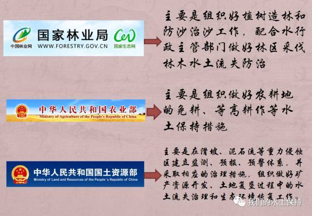国土资源主管部门主要是在滑坡、泥石流等重力侵蚀区建立监测、预报、预警体系,并采取相应的治理措施,组织做好矿产资源开发、土地复垦过程中的水土流失治理和生态环境恢复工作。