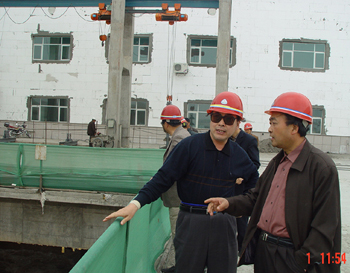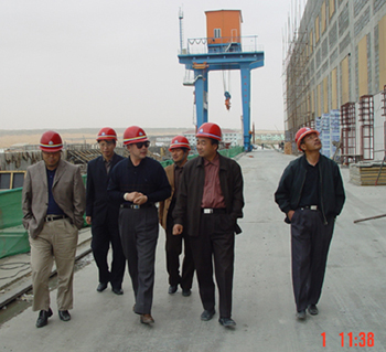 宁夏水利厅灌溉局副局长徐光儒(左一)沙坡头水利枢纽副总经理徐宪平(左五)在大坝查泄水闸口