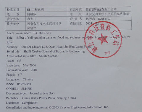 根据西安交通大学教育部科技查新工作站(编号:z08)查新结果和《水利学报》2005年第4期刊登的通知,我站冉大川(高级工程师,已调离)、罗全华(工程师)、刘斌(高级工程师)、王宏(黄委会天水水保站高级工程师)等人的论文《黄河中游地区淤地坝减洪减沙及减蚀作用研究》,今年初被国际四大权威检索工具之一的美国工程索引(engineering information,简称ei)检索收录。