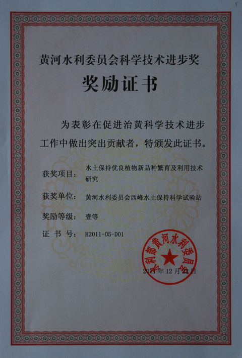 日前,2011年度黄河水利委员会科学技术进步奖揭晓。由黄河水利委员会西峰水土保持科学试验站承担完成的科技部农业科技成果转化资金项目《水土保持优良植物新品种繁育及利用技术研究》获2011年度黄委科学技术进步奖一等奖。