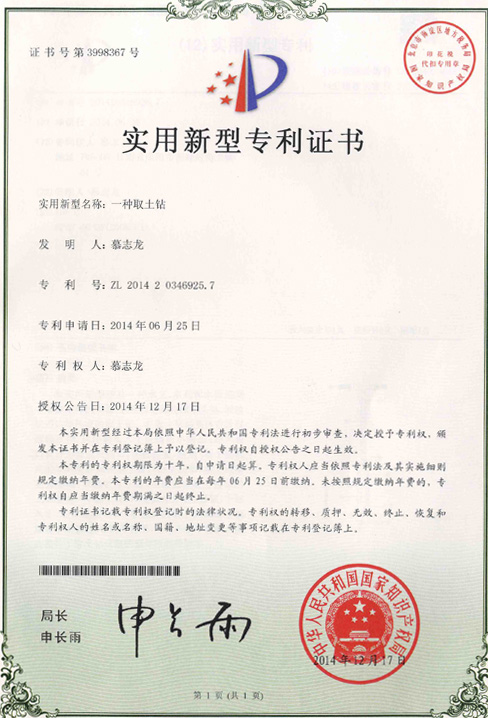 “一种取土钻”于2014年5月开始进行土钻改造,历经反复多次实地测试及改造工作后,2014年6月25日向国家知识产权局申报专利,2014年12月17授权并获得实用新型专利证书。
