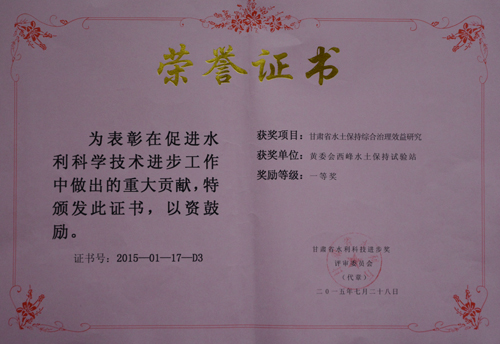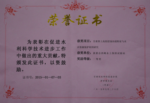 在日前甘肃省水利科技进步奖评审中,西峰局郭锐副总工专题主持的“甘肃黄土高原侵蚀沟道特征与水沙资源保护利用研究”和“甘肃省水土保持综合治理效益研究”项目中分别获得甘肃省水利厅颁发的水利科技进步一等奖。