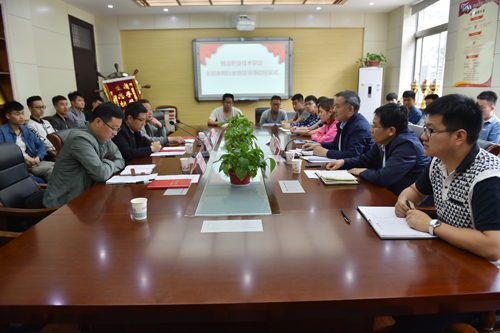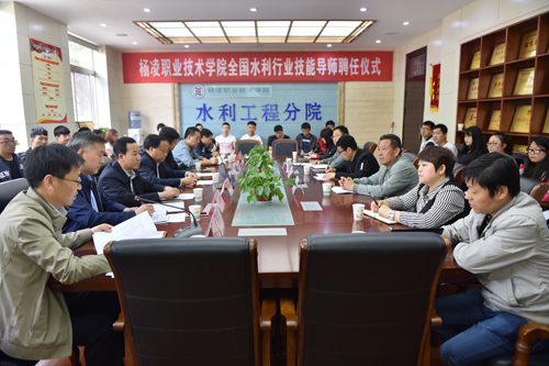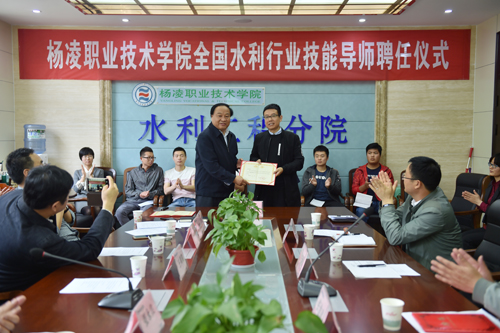 杨凌职业技术学院院长王周锁、副院长王晓地、张永良,教务处、人事处及水利工程分院主要负责人、学生代表等出席了聘任仪式。王晓地副院长与三位技能导师签订了合作协议,王周锁院长给三位技能导师颁发了聘书,并发表了重要讲话。随后,三位技能导师与学院领导就协作事宜进行了商讨,与学院学生进行了面对面交流。