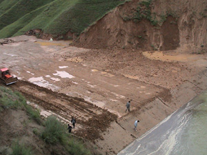 8月26日,地处黄土高原沟壑区的齐家川流域连续二日普降暴雨,累计降雨量高达120毫米。流域内的锁梁沟治沟骨干工程由于施工还未达到设计防汛高程,坝体卧管涵洞尚未修建,不能及时泄洪,致使坝内蓄水过大,水面距坝顶仅剩不到2米,加之周围山体坍塌,水浪不断侵蚀新建的坝体,危险性极大。