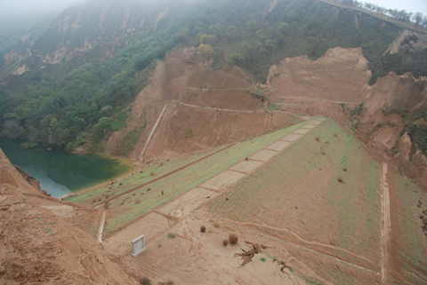 刘家咀骨干坝位于西峰区什社乡塔头行政村,工程由土坝和放水建筑物两大件组成。挡水坝体为碾压均质坝,总坝高35.57m,坝顶长108m,宽5m,总库容55.7万m3。放水工程由放水卧管、输水涵洞、泄水陡坡和消力池组成,均为钢筋砼结构。
