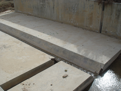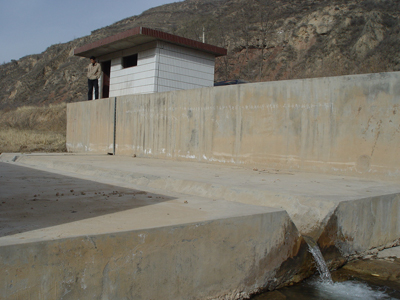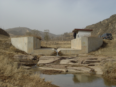 本次考察另外一个较大的收获是,北京林业大学在流域出口所修建的测流断面,采用了矩形断面内套小三角槽的方式(见照片),可以有效地解决流域小水流时观测精度的问题。南小河沟出口测站十八亩台和花果山水库出口观测断面均采用了标准巴歇尔堰进行水位观测,在十八亩台测站以往观测时我们注意到,在通过断面的水量较小时,眼看着有水从断面流出却无法在水尺上读出数据,而这种常流水正体现了流域治理后减少洪水、增加常水的作用,观测到的资料极其宝贵,因此在今后原型观测工作的断面布设上,不妨借用这种断面模式,可以解决大水与小水观测之间的矛盾,从而获取极其宝贵的第一手观测资料。