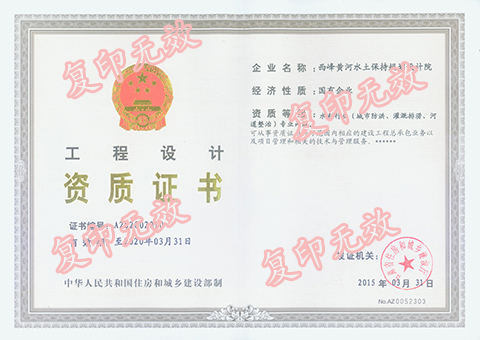 西峰黄河水土保持规划设计院现具有水利工程设计丙级资质(工程设计资证编号:272220-sb)、开发建设项目水土保持方案编制甲级资质(编号为:水保资证甲字第035号)。现有高级工程师7名,工程师25名,涉及水利、水保、农学、林学、工程、水文、地质、地理信息系统等各个专业,规划设计人员熟悉水土保持方案编制、中小型水利工程设计的技术标准与行政法规,与不同行业的业主都有良好的合作经历。有承揽各种水土保持专项规划、可行性研究、工程设计、开发建设项目水土保持方案编制、小型水利工程设计等项目的能力。