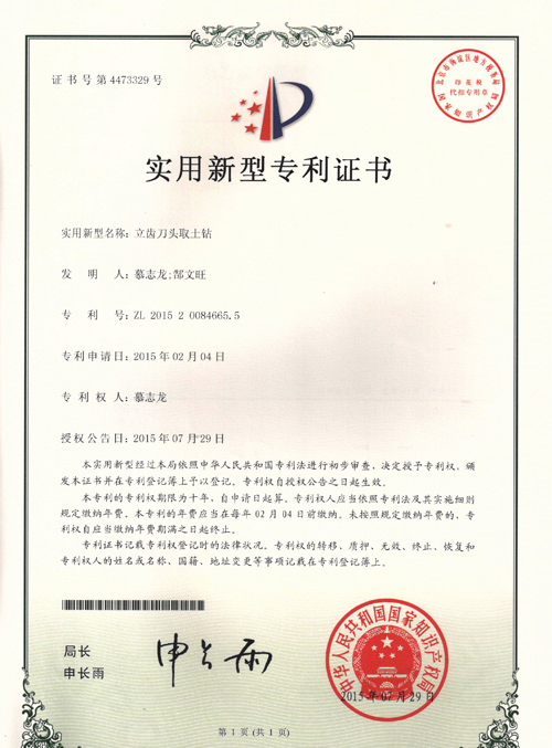 近日,黄河水利委员会西峰水土保持科学试验站工程师慕志龙、郜文旺同志自主研发的“立齿刀头取土钻” 专利技术,通过国家知识产权局的审查,获得中华人民共和国国家知识产权局实用新型专利证书。