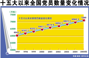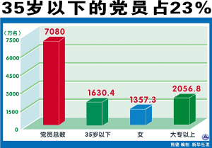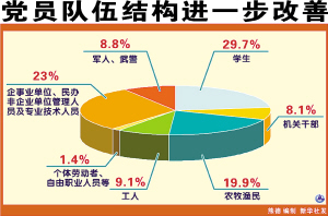 党员队伍和党组织发展呈现以下特点: 发展党员数量增加,年轻党员、女党员、具有大专以上学历的党员比例上升,党员队伍结构进一步改善。2005年全国共发展党员247万名,比上年增长2.4%,其中,在学生中发展党员73.4万名,比上年增加13.7万名,增长5个百分点,增幅最为明显;工人22.6万名,农牧渔民49.2万名,机关干部20万名,企事业单位、民办非企业单位管理人员及专业技术人员57万名,军人、武警21.7万名,个体劳动者、自由职业人员等3.6万名(见图2)。 全国党员中,35岁以下的党员占23%,比上年增长0.3个百分点;女党员占19.2%,比上年增长0.6个百分点;具有大专以上学历的党员占29%,比上年增长1.7个百分点(见图3)。 入党积极分子队伍进一步壮大。全国申请入党人数比上年净增48万人,增长2.8%。2005年全国入党积极分子959.6万人,比上年净增29.1万人,增长3.1%。 党组织在新经济组织、新社会组织、城市街道和乡镇的覆盖面扩大,党的执政基础进一步加强。从业人员50人以上且具有建立党组织条件的9.8万个非公企业中,有97.9%的企业建立了党组织。0.9万个具有建立党组织条件的民办非企业单位中,已有0.8万个建立了党组织,占88.9%,比上年增长1.7个百分点。全国0.6万个城市街道共有党的基层组织18万个,平均每个街道有30个,比上年增加4个;3.6万个乡镇有110.2万个党的基层组织,平均每个乡镇31个,比上年增加2个。 《人民日报》 (2006-06-19 第04版) |