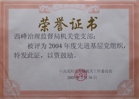 2004年,黄河水土保持西峰治理监督局机关党支部以学习十六大精神为中心,以服务行政、科研、思想政治工作为出发点,按照机关党委的工作部署,紧张有序地开展宣传和思想教育工作。在加强党员自身建设、提高党员队伍整体素质、增强党组织的凝聚力和战斗力,保持共产党员干部的先进性等方面全方位引导。并积极开展党民主评议活动,积极开展精神文明活动,提升党员队伍的精神境界,保证了机关党支部的工作在理论上有新突破,在实践中有新发展。受到了中共庆阳市直属机关工作委员会的嘉奖。